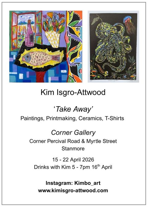 Kim Isgro-Attwood returns to the Corner Gallery Stanmore to display his latest collection of Paintings, Printmaking, Ceramics and T-Shirts.