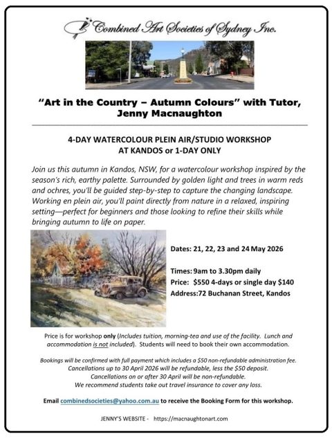 Jenny will be conducting another watercolour workshop in Kandos through the Combined Art Societies of Sydney, and once again this workshop can be booked for the 4 day period from the 21st to 24th May, or you may select just one day.
