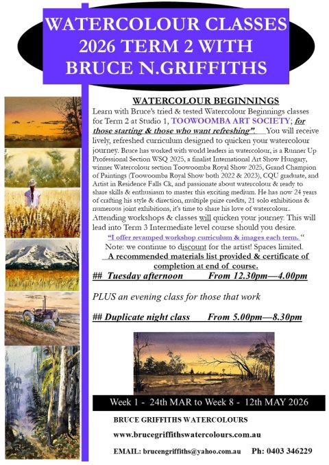 Says Bruce, “I was a late bloomer and now there is never enough time to paint. There is a momentum, a time when all factors fall into place & I am excited about my permanent move to Toowoomba heartland, the exposure to new galleries & new exhibitions; the time to emerge as an artist in the ever-changing region.” Art talks to those who listen. “Now nestled in Toowoomba heartland with a spacious Kleinton studio & a relaxed lifestyle; half urban, half country. A perfect base for travel to all points of the compass and a perfect hub for my homely art studio. Bruce has works on display in Toowoomba’s Met Gallery, Tweed Ultima at Tweed Heads, some local GC eateries & Watling Art Services, Burleigh Heads. Bruce is a prize-winning artist, teacher, exhibitor & increasingly sought after for commissions, workshops & as demonstrator of watercolour fine art. Some of his works can be viewed on his website.